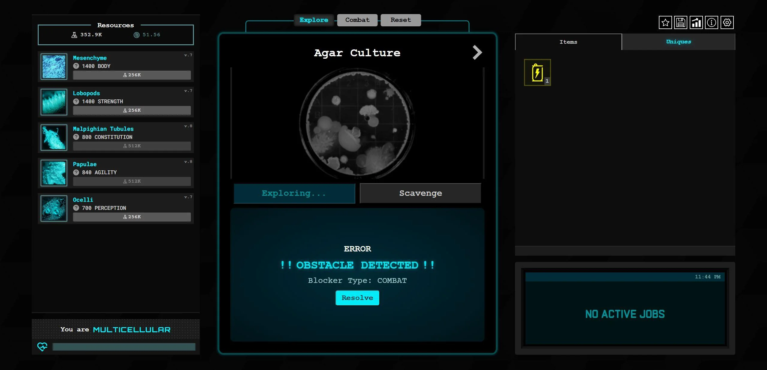 {"saveGameData":{"combatPlayerMovesetUIStore":{"autoUseMoves":[]},"outOfCombatHealthRegenStore":{"currentOutOfCombatHealthFraction":1},"explorationStore":{"hasNewAreaUnlockedNotification":true,"currentExplorationZoneId":"agarCulture","isExplorationActive":false,"explorationZonesProgress":{"agarCulture":{"isUnlockedThisRun":true,"isUnlockedPermanently":false,"volumeExplored":0},"incubator":{"isUnlockedThisRun":false,"isUnlockedPermanently":true,"volumeExplored":0},"samplingRoom":{"isUnlockedThisRun":false,"isUnlockedPermanently":true,"volumeExplored":0},"specimenStorage":{"isUnlockedThisRun":false,"isUnlockedPermanently":true,"volumeExplored":0},"researchWing":{"isUnlockedThisRun":false,"isUnlockedPermanently":true,"volumeExplored":0},"undergroundFacility":{"isUnlockedThisRun":false,"isUnlockedPermanently":true,"volumeExplored":0}},"blockersClearedPermanently":["agarCultureHungerProgressionBlocker","agarCultureThreatsProgressionBlocker","incubatorRespiteProgressionBlocker","incubatorFleetFootedProgressionBlocker","incubatorForeignSubstanceProgressionBlocker","agarCultureToIncubatorShortcutBlocker","samplingRoomFlickersInMurkProgressionBlocker","incubatorToSamplingRoomShortcutBlocker","samplingRoomToSpecimenStorageShortcutBlocker","specimenStorageConsciousThoughtProgressionBlocker","specimenStorageWhiteCaseRedTapeMiscEventBlocker","specimenStorageToResearchWingShortcutBlocker","researchWingToUndergroundFacilityShortcutBlocker","researchWingEchoesInSteelMiscEventBlocker"],"blockersClearedThisRun":[]},"scavengingStore":{"isScavengingUnlocked":true,"isScavengingActive":false,"scavengingZonesProgress":{"agarCulture":{"resourcesScavenged":{"biomatter":0,"mutagen":0,"aberrantMass":0}},"incubator":{"resourcesScavenged":{"biomatter":0,"mutagen":0,"aberrantMass":0}},"samplingRoom":{"resourcesScavenged":{"biomatter":0,"mutagen":0,"aberrantMass":0}},"specimenStorage":{"resourcesScavenged":{"biomatter":0,"mutagen":0,"aberrantMass":0}},"researchWing":{"resourcesScavenged":{"biomatter":0,"mutagen":0,"aberrantMass":0}},"undergroundFacility":{"resourcesScavenged":{"biomatter":0,"mutagen":0,"aberrantMass":0}}}},"resourceStore":{"currentResources":{"biomatter":2500,"mutagen":26000,"aberrantMass":0},"unlockedResources":["biomatter","mutagen","aberrantMass"]},"movesetUIStore":{"hasNewMoveAlert":false},"playerMovesStore":{"currentUnlockedMoves":["feebleHit","ciliarySweep","engulf","ciliaryDance","graze","nematocystJab","toxinDart","recover","fastStrike","hardenCarapace","renew","primeUp","powerStrike","rapidRecovery","rabidBite","vampiricSiphon","exsanguinatingRake","experimentalTreatment","suppression","specialistStrike","assimilate"],"currentMovesets":[["stimulantSurge","suppression","renew","powerStrike","exsanguinatingRake","ciliaryDance","specialistStrike","toxinDart"],["stimulantSurge","firstAid","exsanguinatingRake","suppression","renew","vampiricSiphon","assimilate","specialistStrike"],["suppression","stimulantSurge","firstAid","toxinDart","recover","hardenCarapace","primeUp","rabidBite"]],"currentMovesetIndex":2},"mainGameScreenSubtabsDisplayStore":{"currentMainGameScreenSubtab":"explore","subtabStatus":{"explore":{"isUnlocked":true,"isNew":false,"hasNotification":false},"combat":{"isUnlocked":true,"isNew":false,"hasNotification":false},"reset":{"isUnlocked":true,"isNew":false,"hasNotification":false}}},"inventoryUIStore":{"isItemsFeatureUnlocked":true,"currentInventorySubtab":"items","subtabsWithNotifications":["uniques"],"pendingNotificationItemIds":["researcherFriend","bloodstainedIdCard","bloodstainedIdCard"]},"userPreferencesStore":{"numberDisplayFormat":"standard","timeDisplayFormat":"12h","eventPopupDelayInMs":400,"gameAutosaveIntervalInSeconds":10,"shouldPauseBattleOnCombatStart":false,"doubleClickToMutate":true,"shouldEnableImageColorFilters":true,"renderDynamicStars":true,"shouldAutoDecimate":false,"shouldShowExtraTooltips":true,"challengeModeEnabled":false,"shouldRememberAutocastMoves":false,"timeInRunMultiplierCapValue":null},"mainScreenStore":{"currentMainScreen":"mainGameScreen"},"responsiveUiStore":{"lastSelectedMainGameScreenPanel":null,"shouldShowMiniOrganButtonNotification":true,"shouldShowMiniMiscellaneousButtonNotificationBasic":true},"itemsStore":{"playerUniqueItemsData":["handheldTransmitter","firstAidKit","standardIssueFirearm","resonanceBlaster"],"playerGeneralItemsData":{"synapseAccelerator":100,"energyDrink":100,"biofilmShield":100,"generalAntibiotics":100,"regenSerum":20,"stemCellCluster":100,"growthBooster":100,"myelinExtract":100,"instantCoffee":100,"creatinePowder":100,"adrenalineStimulant":100,"oculusGraft":100,"eyedrops":100}},"archiveLogsProgressionStore":{"isArchiveFeatureUnlocked":true,"unlockedArchiveLogIds":["danielFirstDayOfOnboarding","astridBeginningOfVoidrotStudyVii","astridToFindACure","astridBehaviorReplication","danielNewAssignment","danielLabAccident","danielJuniorResearcher","danielUnofficialPromotion","astridReassignment","danielOnNovaAndVoidrot","astridPatterns","danielMeltdown"],"readArchiveLogIds":["danielFirstDayOfOnboarding","danielNewAssignment","danielLabAccident","astridBeginningOfVoidrotStudyVii","astridToFindACure","astridBehaviorReplication","danielJuniorResearcher","danielUnofficialPromotion","astridReassignment","danielOnNovaAndVoidrot","astridPatterns","danielMeltdown"]},"archiveQuestsStore":{"completedArchiveQuests":["danielQuest1","astridQuest1","astridQuest2","astridQuest3","danielQuest2","danielQuest3","danielQuest4","danielQuest5","astridQuest4","danielQuest6","astridQuest5","danielQuest7"]},"transmitterStore":{"isTransmitterUnlocked":true,"archiveDecodeQueue":[],"currentDecodingArchiveId":null,"currentDecodingArchiveProgress":0},"eventFlagsStore":{"eventFlags":{"secretSaferoomDoorFound":1}},"organStore":{"currentOrgansSaveData":{"flesh":{"organId":"unicellularFlesh","level":1,"isUnlocked":true},"limbs":{"organId":"unicellularLimbs","level":1,"isUnlocked":true},"lungs":{"organId":"unicellularLungs","level":1,"isUnlocked":true},"liver":{