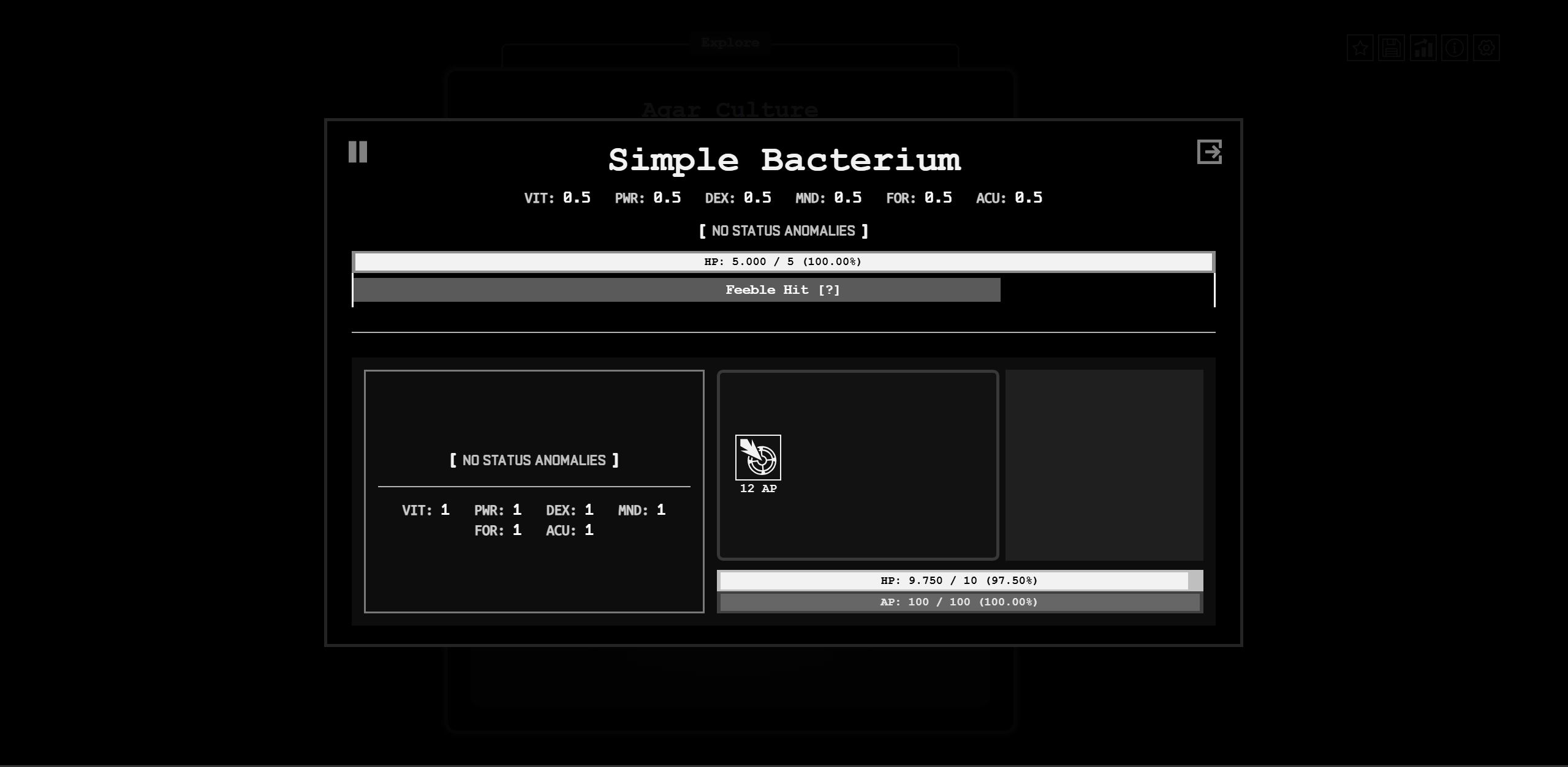 10/10, especially for your first ever fully finished game! Incrementals normally get boring or slow after the first bit of gameplay, but the design elements and the story in BIOTOMATA made it fun the whole way through. Good combat system, whenever it started feeling repetitive something shook things up, good writing, good encounter design, well balanced, fun details everywhere, and in some areas challenge for 100%ers! (the stage 2 no daniel run took me the most tries, the final boss is good at dealing with the fortitude poison build)